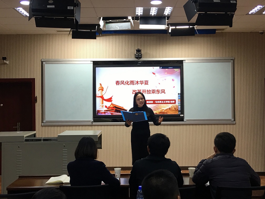 经过前期宣传,同学们积极参与此次诵读比赛。比赛选手们精心选择诵读内容,赛前认真排练,比赛如火如荼,取得了非常好的效果。其中杨柳同学的《春风化雨沐华夏 改革开放乘东风》着眼于我国改革开放取得的伟大成就及奋斗历程,观众们听后振奋人心、深受鼓舞,张望和张敏妍同学的《我的祖国》饱含深情,唤醒了在场每位听众的民族自豪感和爱国热情,谭登科和马晓艳同学的《邓小平之歌——拓荒岁月》内容深刻,歌颂了改革开放的伟大创举,同时也流露出对邓小平同志的深深思念。以及李雪梅、周鼎、赵瑾怡同学的《与祖国同行》展现了当代老员工与祖国共奋进的信念与决心。