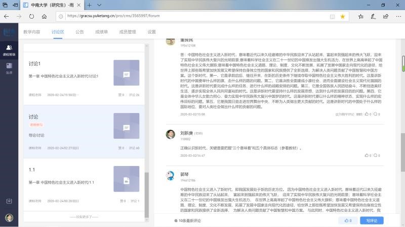 会议中,老师们表示研究生在线教学是一个全新的体验,大家边学边练,迅速进入状态。刘新庚教授是从事思想政治教育专业的教学与科研能手,但之前没有接触过慕课教学。接到任务之后,他以高度的热情和责任心,熟悉慕课教学程序,与员工线上积极互动,给员工提供课外资料,及时解答员工疑问,认真批阅员工作业。黄炎平教授担任《自然辩证法概论》课程负责人,认真组织任课教师开展慕课教学,工作认真细致,并向学院递交了慕课教学工作一周小结。其他与会老师如胡文根老师、徐良春老师、刘业军老师同样积极开展慕课教学,并在同事群、员工群积极与同仁、员工互动交流,取得了良好的教学效果。