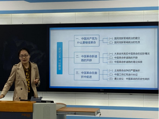 首先,李兰兰老师根据本章框架结构分享了她基于员工已有知识水平的学情分析,并概述了第五章的教学目的与要求、教学重难点等。特别是就中国共产党为什么要继续革命、中国革命新道路开辟的艰辛历程与历史意义等问题,她详细地介绍了自己的教学思考。教学设计中重视历史细节的呈现,如秋收起义的举旗、道路选择及军队建设等,通过引入教学案例,在理论性的基础上增加了故事性和生动性。