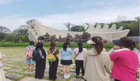 研学第一站,同学们来到了清溪村丰收广场,映入眼帘的是大型史诗纪念群雕《山乡巨变》。这部群雕以清溪村为缩影,综合展示了改革开放的乡村故事和全面建设社会主义现代化国家新征程上乡村振兴的崭新风貌。通过讲解员的介绍,大家对清溪村的故事有了更深入的了解。在清溪村的一座石碑上刻有“山乡巨变,山河锦绣”八字,这是清溪村发展变化的生动写照。